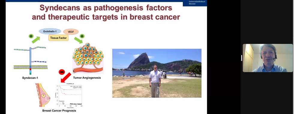 Uma palestra muito aguardada encerrou o primeiro dia, online, do Simpósio de Oncobiologia. O glicobiologista Martin Götte, professor do Departamento de Ginecologia e Obstetrícia do Hospital Universitário Münster, na Alemanha, apresentou seus estudos com foco na matriz extracelular, proteoglicanos, células-tronco e microRNA. O seu objetivo de pesquisa é adotar uma abordagem translacional, fornecendo a base para o desenvolvimento de novas terapias e ferramentas de diagnóstico não invasivas para tratar o câncer de mama.